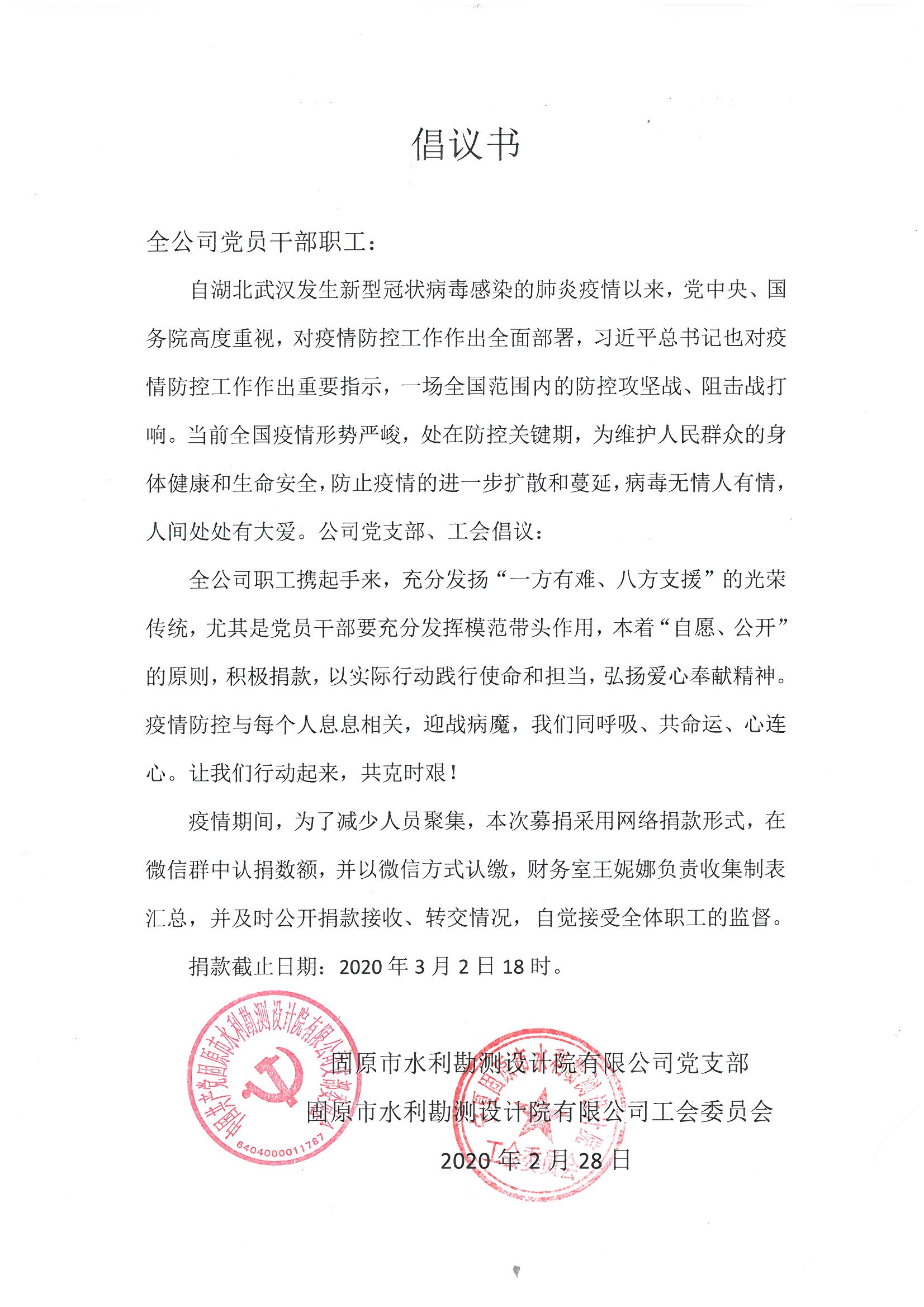 固原市水利勘測設(shè)計(jì)院有限公司為武漢疫情捐款